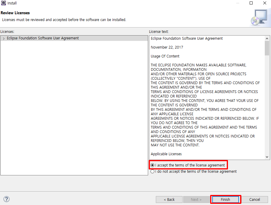 "I accept..." 체크 > Finish