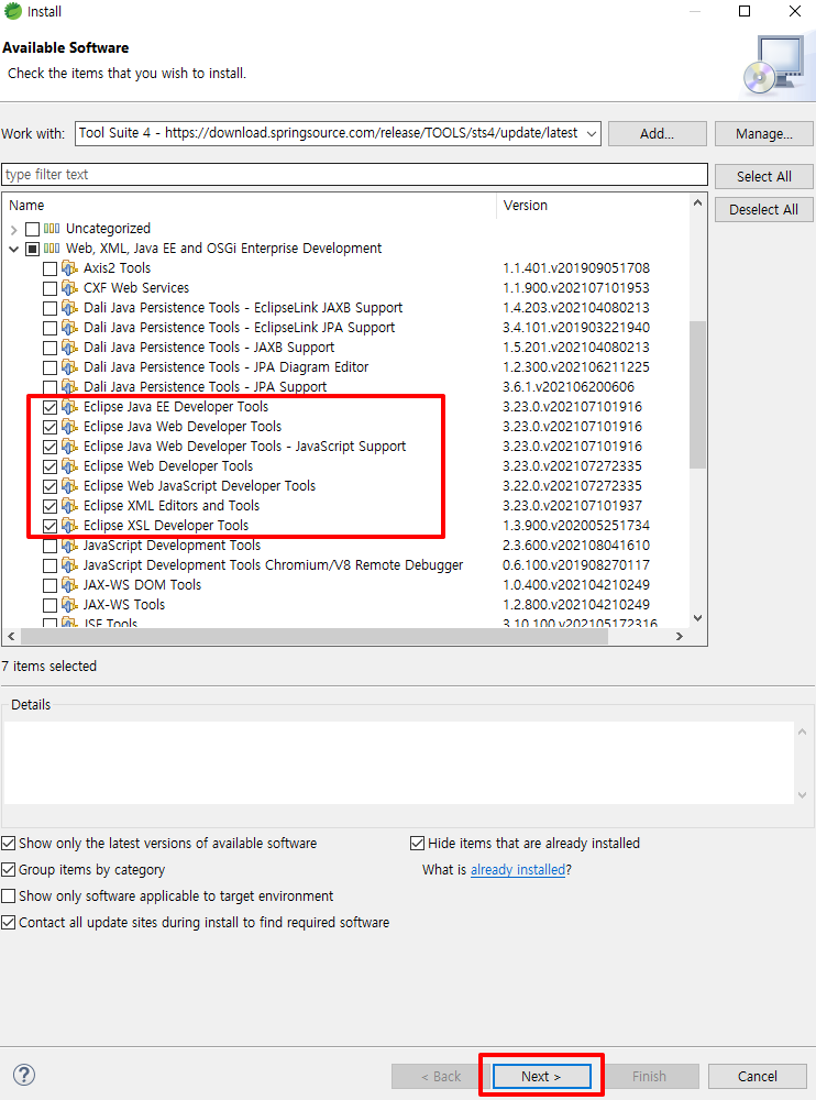 Web, XML, Java EE and OSGi Enterprise Development 중 Eclipse연관 7개 Tools 체크 > Next