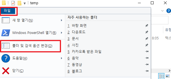 탐색기 왼쪽 상단 파일 > 폴더 및 검색 옵션 변경