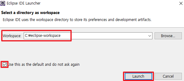 > Use this as the default and do not ask again 체크(다음에 workspace 위치 변경을 원할 경우 미체크)