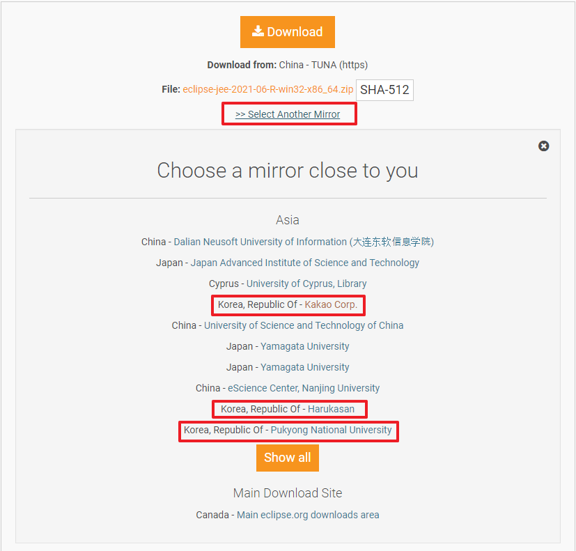 ">> Select Another Mirror" 선택 후 "Korea, Republic Of" 선택 => 다운로드 시작